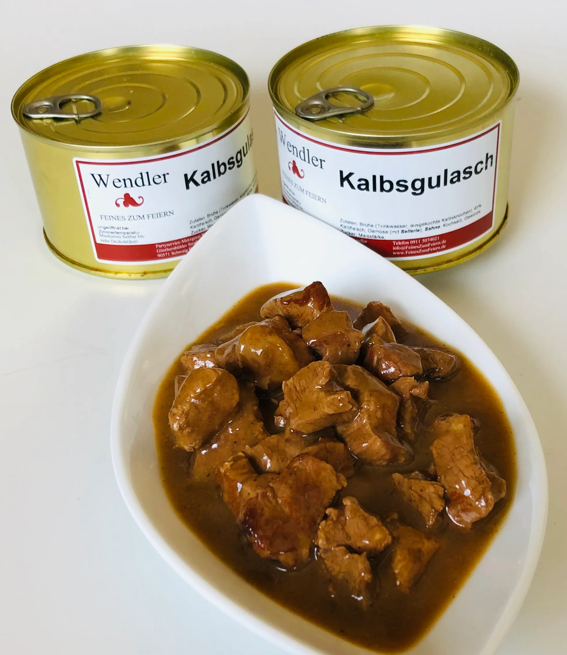 Für unser Kalbsgulasch verwenden wir hauptsächlich Fleisch aus der Schulter, dieses Braten wir kurz an und füllen es mit unserer hausgemachten Kalbsbrühe auf. Nachdem es dann etwa 15 Minuten gekocht hat geben wir einen guten Schluck Sahne zum Abschmecken dazu, die Kräuter und Gewürze geben wir erst gegen Ende der Kochzeit dazu um ihr Aroma zu erhalten. Dann wird das Kalbsgulasch in Konservendosen abgefüllt und im Autoklaven unter Druck auf über 100 Grad erhitzt. Damit wird eine Haltbarkeit von 18 Monaten erreicht, Sie sollten die Konserven jedoch möglichst kühl lagern und nicht direkter Sonneneinstrahlung aussetzen. Wir garantieren bei Lieferung an Sie mindestens 6 Monate Restlaufzeit des MHD. Die Dosen haben im Deckel einen Stahlring zum aufziehen, Sie benötigen also keinen separaten Öffner.