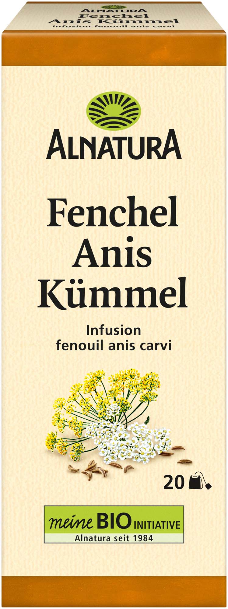 Die sorgfältig ausgewählten und schonend verarbeiteten Früchte von Fenchel, Anis und Kümmel verbinden sich zu einen angenehm mild-würzigen Teegenuss. Pro Tasse einen Teebeutel mit sprudelnd kochendem Wasser übergießen und acht bis zehn Minuten ziehen lassen. Die Zutaten für den Alnatura Fenchel-Anis-Kümmel-Tee stammen aus biologischer Landwirtschaft. 20 Aufgussbeutel pro Packung.