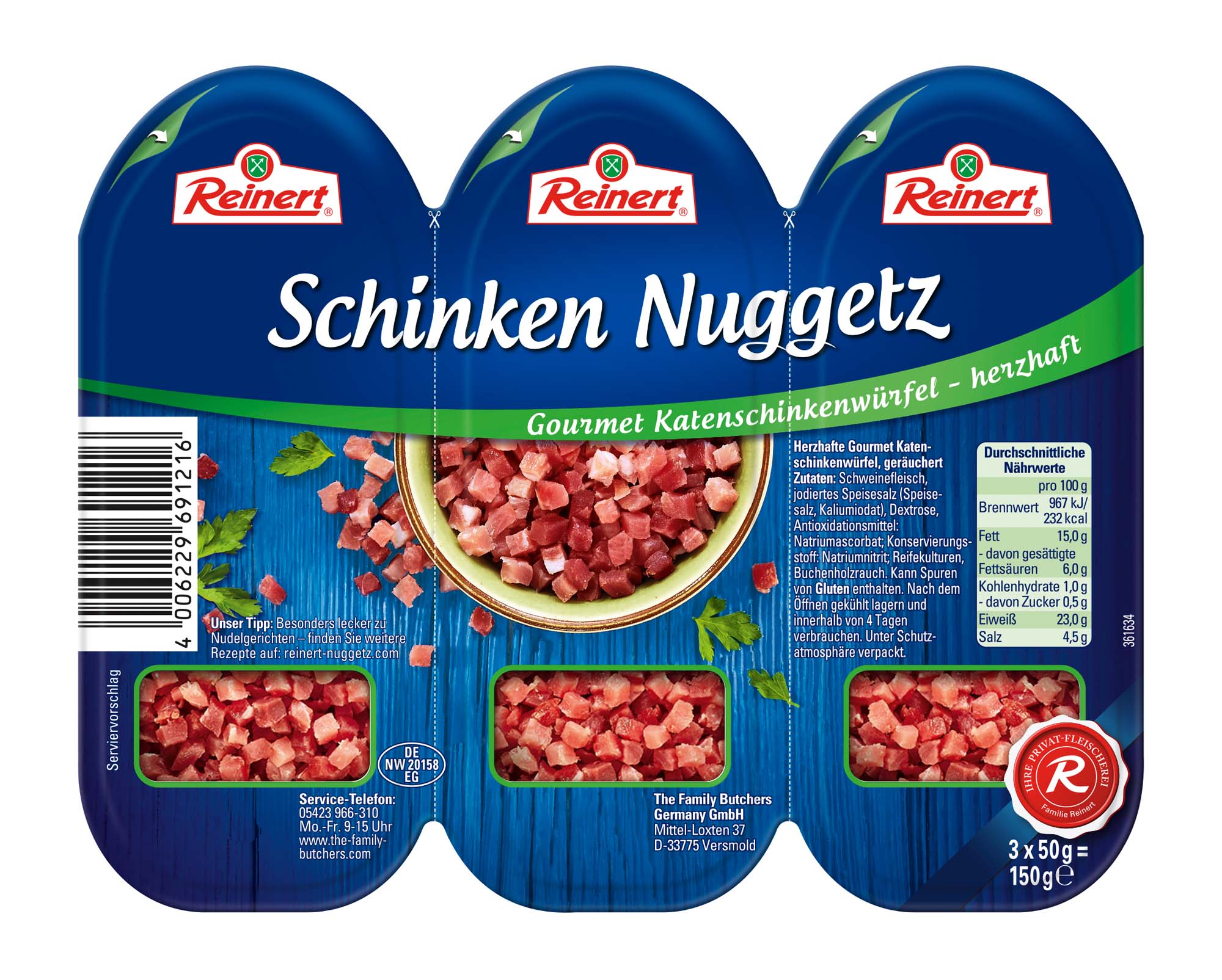Unsere Schinken Nuggetz sind praktische Würfel aus feinem Gourmet-Katenschinken, die bestens für die moderne, schnelle und frische Küche geeignet sind. Sie verfeinern sowohl kalte als auch warme Gerichte und geben immer das gewisse Extra an Geschmack – egal ob beim Backen, Braten oder pur aufs Brot. Extra mager mit nur 3 % Fett eignen sie sich perfekt zum Verfeinern von leichten Speisen, Salaten oder Sandwiches.